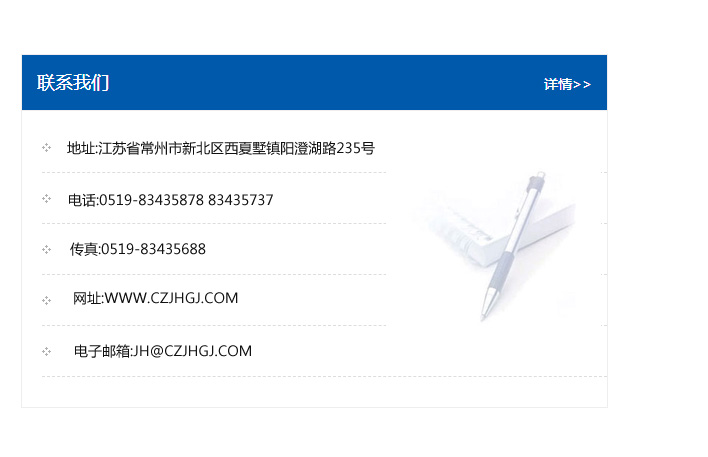 地址:常州市新北區友邦商務大廈1幢16、17層  電話:0519-85101652  傳真:0519-85112595  郵編:213022  網址:www.cz-jiayue_cn.dqscl.com  郵箱:xiajifengaa@163.com